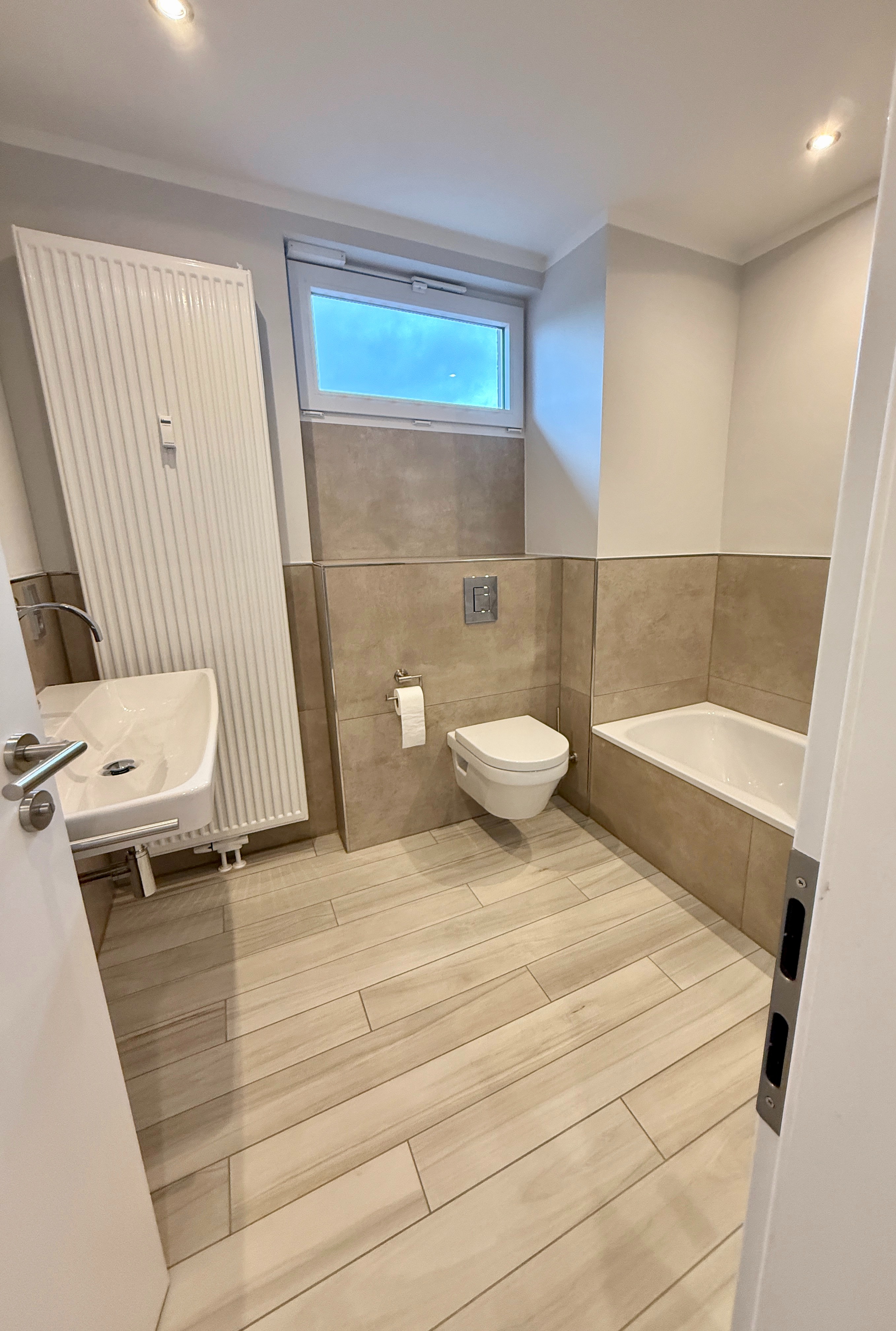 Das Herzstück der Wohnung ist das aufwendig modernisierte Badezimmer mit Fenster; hier erwarten Sie eine Dusche mit Regenduschkopf, eine Badewanne sowie geschmackvolle Fliesen in zeitlosem Design.