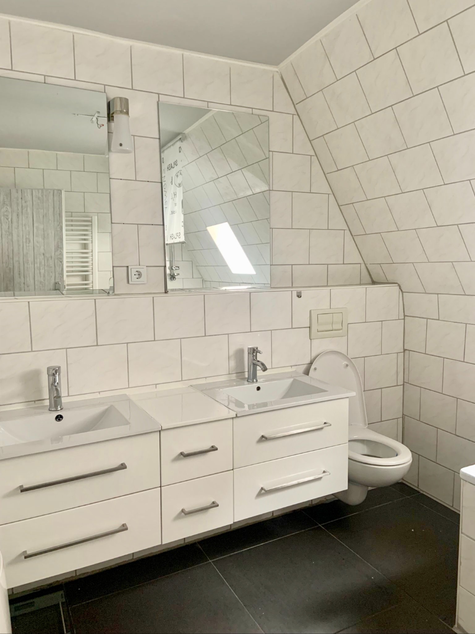 Das Badezimmer ist ebenfalls frisch renoviert und wird inkl. der Badmöbel vermietet. Da zur Wohnung kein eigener Kellerteil gehört, kann ein Teil des Speichers zum Unterstellen von Utensilien benutzt werden, der direkt an der Wohnung angrenzt.